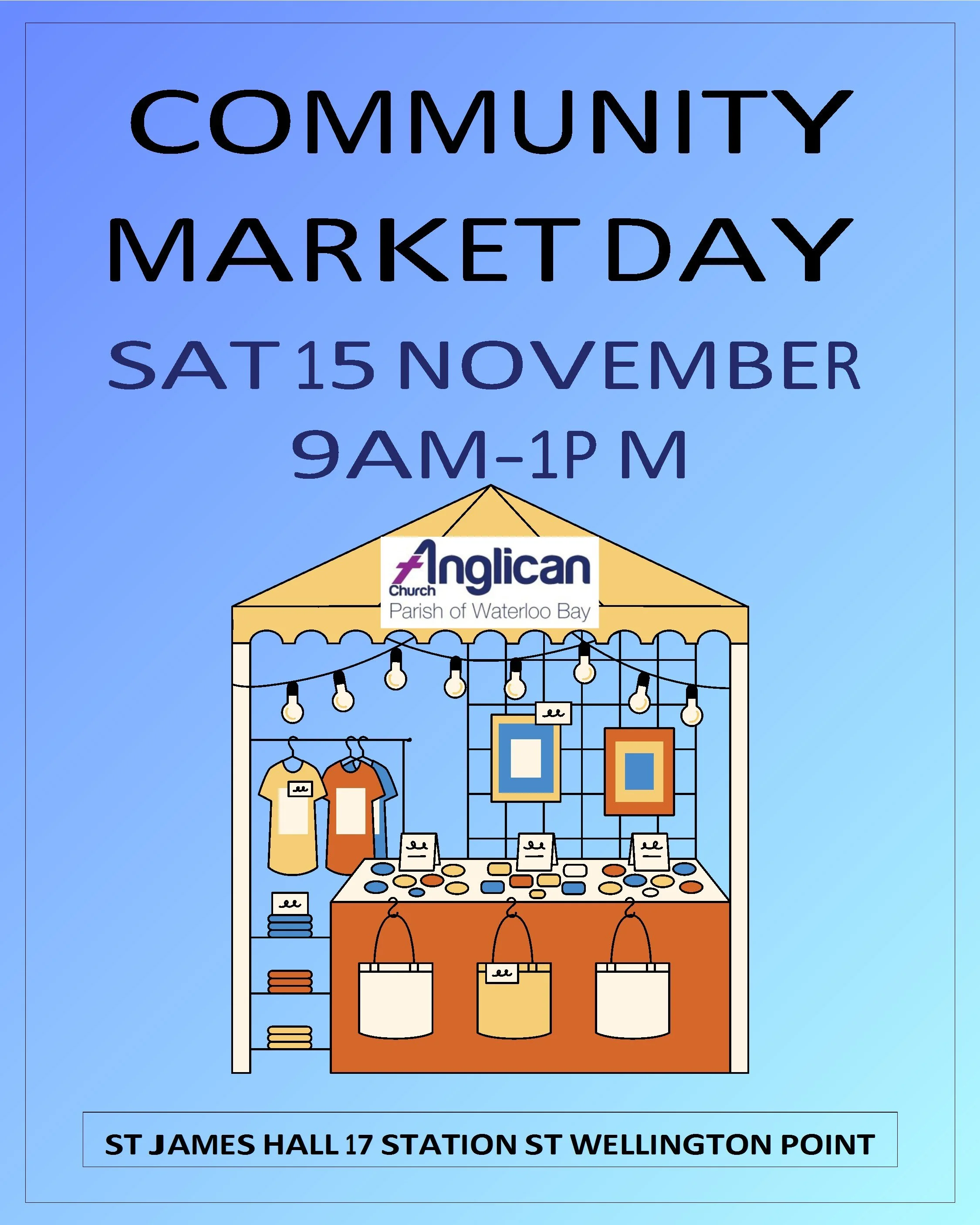 Market day Saturday, November 15, 2025 9:00 AM 1:00 PM 09:00 13:00 Google Calendar ICS St James church hall17 Station St Wellington PointStalls include goods & chattels | toys | books | & more