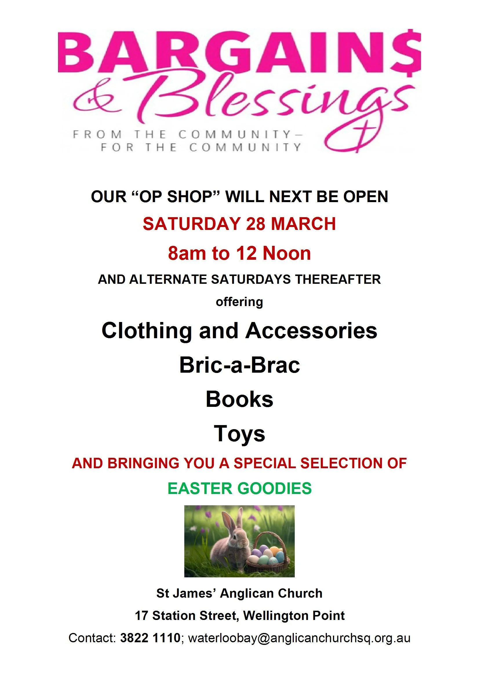Join us at the Anglican Parish of Waterloo Bay Market Day with a special selection of Easter goodies—perfect gifts and vintage finds at bargain prices. Stalls include clothing and accessories, bric-a-brac, books, toys and our special Easter goodies table.